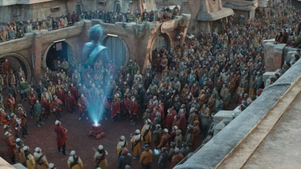 Là où la diffusion d’Andor saison 2, en parallèle de ce qu’il se passe à Gaza depuis octobre 2023 trouve un écho glaçant est dans la prononciation lors de son dernier discours du terme génocide pour qualifier la situation des ghormans. En employant ce terme, que notre société cherche à mettre de côté, Andor rappelle l’importance de dire les choses et de ne pas chercher à rationaliser la mort d’individus. Une scène telle celle du discours, sur laquelle je reviens encore légèrement plus bas, est des plus importantes dans un média mainstream pour sa capacité à réveiller les spectateurs sur ce qu’il se passe dans le monde. Bien évidemment pour cela il faudrait que chacun soit en mesure de comprendre ce que raconte une œuvre et ne se limite pas à consommer une série ou un film mais parvienne à le réfléchir.