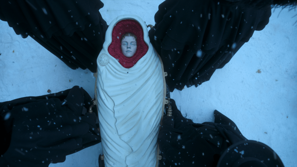 Ainsi tout se voit, tout est trop numérique et l’image ne possède du charme que lorsqu’apparaissent des couleurs dans la composition. En effet, des éléments picturaux viennent redonner espoir dans l’œuvre de Del Toro, dans son talent cinématographique pas encore disparu et dans les capacités d’éclairage de son directeur de la photographie Dan Laustsen. L’arrivée du père au château ou l’enterrement de la mère en sont les deux exemples les plus retentissants : l’opposition entre les vetements noirs du patriarche et rouges de la mère dans le premier moment ainsi que l’opposition entre ce même rouge, le noir des invités aux funérailles et le blanc de la neige dans le second. La première heure, pendant ces deux instants, gagne en vitalité, en recherche visuelle. Ces éléments ne sont pas les seuls, la musique d’Alexandre Desplat cherche à réveiller le film via ses compositions romantiques et entraînantes, prenant avec elles un nouvel élan pour les scènes dans lesquelles elles s’entendent de manière suffisamment marquée. Quelque chose est là, quelque chose laissant présager que Del Toro ne s’abandonne pas encore.